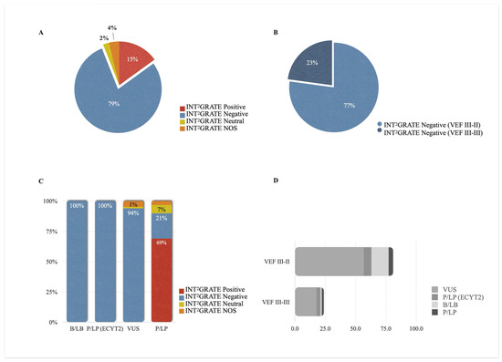 Consistent with a conservative VEF, all patients with the INT2GRATE Positive variants (n = 20) exhibited classic VHL syndrome (Supplementary Materials Table S4, Online INT2GRATE Portal). A total of 105 patients had the INT2GRATE Negative variants (Figure 4A), suggesting that the integrated evidence does not support the involvement of these germline variants in VHL syndrome in these patients. In this category, 77% (81/105) of the variants met the criteria for INT2GRATE III–II, while 23% (24/105) were INT2GRATE III–III, consistent with the absence of VHL tumors or any other tumors (Figure 4B, Supplementary Materials Tables S3–S6, Online INT2GRATE Portal).