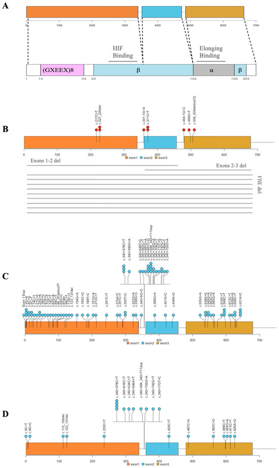 Von Hippel–Lindau syndrome (VHL, OMIM # 193300) is a rare, autosomal dominant hereditary cancer syndrome caused by the heterozygous germline pathogenic variants in the VHL gene. With an estimated prevalence of 1 in 35,000 [1], VHL syndrome is characterized by the presence of multiple tumor types, specifically clear cell renal cell carcinoma (ccRCC), hemangioblastomas of the central nervous system and retina, pheochromocytomas, pancreatic cysts, and neuroendocrine tumors [2,3]. The mechanism of disease in VHL syndrome is the loss of function of the VHL tumor suppressor gene, leading to the accumulation of hypoxia-inducible factors (HIFs) and the formation of highly vascularized tumors [4,5,6]. Nearly 100% of the individuals with VHL syndrome are expected to be symptomatic by the age of 65 years, but some germline VHL variants may be associated with lower penetrance [1,7,8].