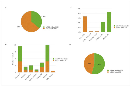 Of the 75 patients with ccRCC, 36% (27/75) exhibited LOH due to biallelic somatic inactivating alterations in the VHL (Figure 6A). The most common LOH mechanism involved one somatic SNV and one somatic copy deletion in the VHL (Figure 6B). No significant differences were observed in the type of inactivating SNV (missense vs null) between the ccRCC cases with or without LOH (Figure 6C) or their distribution across the VHL exons (Supplementary Materials Figure S1). Null VHL variants (n = 37) were slightly more frequent in the ccRCC cases without LOH (54% or 17/37) compared to those with LOH (46% or 20/37) (Figure 6D). These results show that, in a proportion of the ccRCC cases, LOH and bilateral somatic VHL alterations may not be present. This could be attributed to assay limitations and the inability to detect possible complex or cryptic rearrangements in the VHL. Alternatively, alterations may not be present at the genomic level (e.g., epigenomic hypermethylation of the VHL promoter). This limitation in detecting LOH and somatic inactivating alterations in the VHL is addressed in the INT2GRATE|VEF to improve accuracy. The scenarios that require the somatic genetic entry in combination with other related evidence include I–II, I–III, II–I, II–II, II–III, and III–I (Supplementary Materials Table S1).