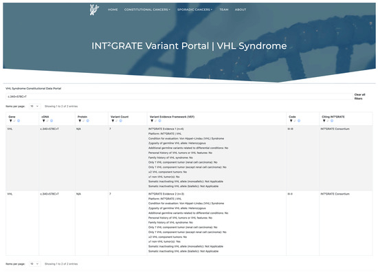 The INT2GRATE|Oncology Consortium has addressed this challenge by developing an integrated evidence framework to assess the actionability of the germline variants using germline data, clinical genetic information, tumor-derived data, and somatic genetic evidence (INT2GRATEoncology.org). We have previously presented the application of INT2GRATE in the assessment of variant actionability in multiple hereditary cancer syndromes, and further demonstrated that this comprehensive approach can differentiate between non-syndromic sporadic tumors or syndromic cancers [8,10,11,12,13]. Here, we present the novel INT2GRATE variant evidence framework (VEF) for evaluating the germline variants in VHL syndrome. We describe the parameters and rationale behind the VEF, discuss the collation and programmatic processing of 2672 variants in the INT2GRATE|VHL program, and unveil the launch of the first open INT2GRATE|Variant Portal for public access. This novel framework integrates evidence derived from constitutional and sporadic variants, VHL differential conditions, and allelic conditions. Processing the INT2GRATE|Variants and sharing comprehensive constitutional and somatic evidence is pivotal in advancing precision oncology.
