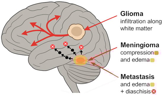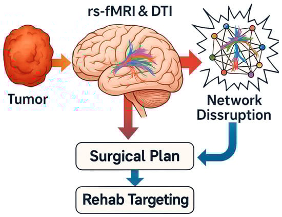 Mounting evidence indicates that intracranial tumors produce far-reaching disturbances in brain function by disrupting large-scale neural networks [1,2,3]. Unlike a traditional localizationist view, in which a tumor’s effects are confined to an adjacent cortex, a network perspective reveals that even regions distant from the lesion can be functionally affected via disrupted connections [1]. Cognitive deficits in brain tumor patients often reflect global network dysfunction rather than only focal damage [2]. Pioneering clinical observations and electroencephalography (EEG) studies first noted that tumors cause diaschisis, a depression of activity in areas remote from the lesion [3]. Today, resting-state functional MRI and diffusion tractography enable us to map these disruptions systematically as well as changes in the brain’s connectome—the comprehensive map of neural connections [4].