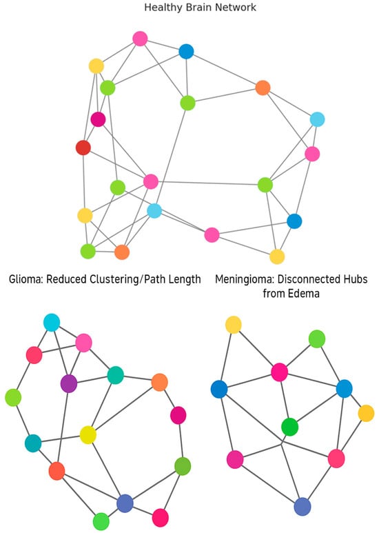 Figure 2 provides a comparison of the connectivity profiles that might be seen in brains affected by brain tumors and the related effects on hubs, nodes, and clusters.