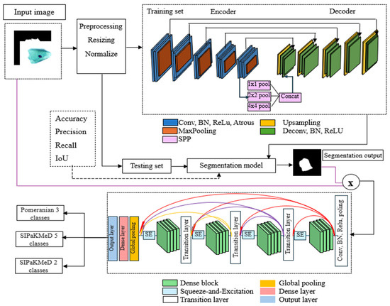 Although previous studies, such as those of [18], have taken advantage of U-Net and SegNet architectures for cervical cell segmentation, handling overlapping structure challenges, such as limited multiscale feature extraction, have been encountered [17,19]. To address these issues, this study proposes SPP-SegNet and SE-DenseNet201 to achieve superior segmentation and classification accuracy in the Pomeranian and SIPaKMeD datasets compared to the standard SegNet and DenseNet201 methods.