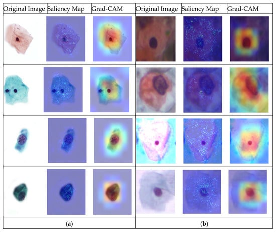 Saliency map and Grad-CAM visualization: (a) Pomeranian and (b) SIPaKMeD dataset.