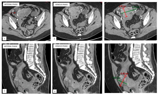 Upon computed tomography (CT) (Figure 1), uterine PEComas typically appear as iso- to hypodense masses relative to the surrounding myometrium on non-contrast images. Additionally, internal hemorrhage can be seen as hyperdense areas [16,22].