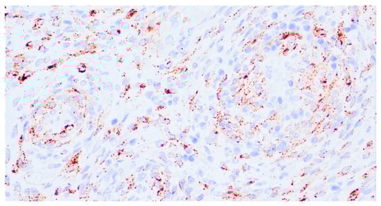 PEComas are characterized by the immunoexpression, among others, of both melanocytic markers (HMB-45, Melan-A, MiTF, and PNL2) and myoid markers (desmin, smooth muscle actin, muscle-specific actin, myosin, and calponin). HMB-45 (more specific) and Cathepsin K (more sensitive) are expressed in virtually all PEComas, ranging from diffuse staining to isolated positive cells (Figure 3). Melan-A staining and MiTF are expressed with variable intensity in more than two-thirds of cases, and they are usually focal and less extensive than HMB-45 [6]. MiTF tends to be weak and lacks specificity, and PNL2 shows variable cytoplasmic expression. Except for TFE3-rearranged tumors, the expression of at least one smooth muscle marker is typically strongly positive (SMA being the most expressed). Overall, melanocytic markers are predominantly expressed in epithelioid cells, while myogenic markers are more commonly seen in spindle cells, but overlaps may occur [15].