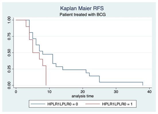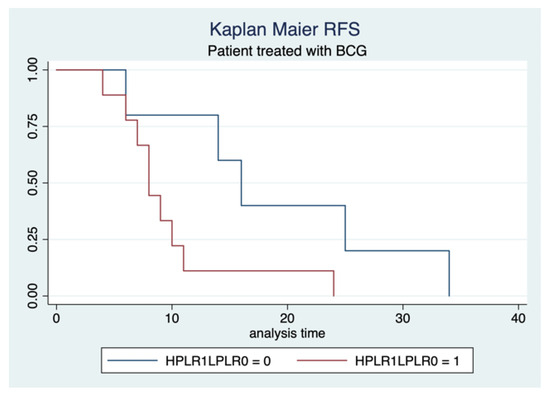 We found another association between PLR levels and RFS in patients treated with BCG, without differences in terms of tumor dimensions (HR 3.7, 95% CI: 3–14, p = 0.04) (Figure 3).