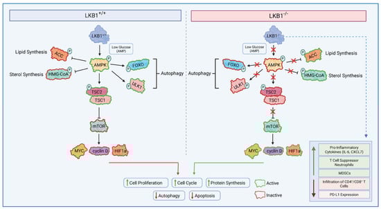 One of the major pathways controlled by LKB1-AMPK is mTOR, which controls cell growth in eukaryotes and is poorly regulated in most human cancers. mTOR Complex 1 (mTORC1) recruits various downstream substrates, such as MYC, Hypoxia-Inducible Factor 1 (HIF1), and cyclin D, which promote processes such as angiogenesis, cell growth, and cell cycle progression, all of which play a role in tumour progression [28]. Additional upstream components of mTORC1 include tuberous sclerosis complexes 1 and 2 (TSC1/2). TSC2 is a tumour suppressor that forms a heterodimer complex with TSC1 and indirectly inhibits mTORC1. Thus, the loss of TSC1/TSC2 leads to the hyperactivation of the mTORC1 complex [29]. Low levels of energy/ATP within the cell result in LKB1-dependent activation of AMPK, which promotes the production of rapidly available energy with ATP and slows down cell growth via the phosphorylation of TSC2 and the inhibition of mTORC1 activity [30,31]. Hence, LKB1 negatively regulates mTORC1, and LKB1 inactivation can lead to mTORC1 hyperactivation (Figure 1).