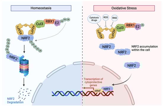 KEAP1-dependent signalling. In normal circumstances, NRF2 interacts with two KEAP1 molecules via the ETGE and DLG motifs in its Neh2 domain to cause NRF2 ubiquitination via the activation of the Cul3-based E3 ligase complex [51]. After its ubiquitination, NRF2 is marked for degradation by the 26S proteosome, with low cytoplasmic levels. When cells are exposed to oxidative stress or cytotoxic drugs, such as chemotherapies, sensor cysteines in KEAP1, especially Cy151, interact with electrophiles and ROS, causing conformational changes and resulting in the detachment of NRF2 from KEAP1 and the disruption of KEAP1-mediated NRF2 degradation [52]. This reduces the binding affinity between the two proteins, allowing NRF2 to translocate to the nucleus to activate the transcription of various protective genes. Once oxidative stress is removed, KEAP1 translocates to the nucleus and brings NRF2 out to the cytoplasmic Cul-E3 ubiquitin ligase complex for degradation [51].