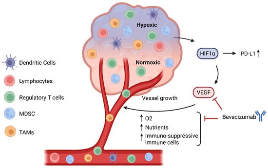 Relationship between hypoxia and angiogenesis. A hypoxic TME will lead to the activation and stabilization of hypoxia-inducible transcription factors (HIFs), especially HIF-1α, which directly binds to the PD-L1 promoter to upregulate its expression and also plays a role in angiogenesis. HIF-1α directly upregulates VEGF, leading to the formation of new blood vessels, which increase the oxygen and nutrient supply to the tumour. Additionally, angiogenesis also leads to greater infiltration of immune cells, especially regulatory T cells, MDSCs, and TAMs, hence contributing to the immunosuppressive TME. Bevacizumab, an anti-VEGF, can inhibit the binding of VEGF to its receptor VEGF-R and prevent the formation of new blood vessels and, by extension, an immunosuppressive TME. MDSCs: myeloid-derived suppressor cells. TAMs: tumour-associated macrophages. TME: tumour microenvironment.