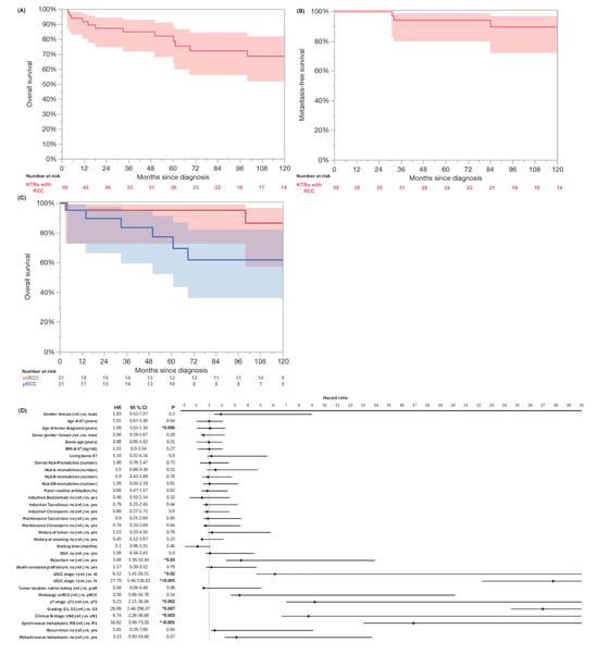 Kaplan–Meier analysis of overall survival (A) and metastasis-free survival (B) of whole cohort of kidney transplant recipients (KTRs) with de novo renal cell carcinoma. Kaplan–Meier analysis and log-rank testing indicated significant inferior OS in UICC stages ≥ III (blue) compared to UICC stage I (red, p < 0.001) (C). Univariate Cox regression identified acute rejection (HR: 3.48, 95% CI: 1.16–10.44, p = 0.03), older age at RCC (HR: 1.09, 95% CI: 1.03–1.16, p = 0.006), advanced UICC stage III (HR: 6.12, CI: 1.41–26.51, p = 0.02) and IV (HR: 27.79, CI: 5.56–138.83, p < 0.001), higher pT stage (HR: 9.23, 95% CI: 2.21–38.56, p = 0.002), cN1 (HR: 8.74, 95% CI: 2.08–36.68, p = 0.003), M1 (HR: 16.92, 95% CI: 3.90–73.30, p < 0.001), and high-grade tumors (G1/G2 vs. G3, HR: 26.99, 95% CI 2.46–296.07, p = 0.007) as significantly associated with poor overall survival (D). Significant p values are indicated by * p < 0.05.