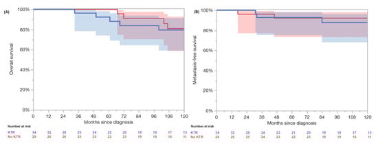 Propensity matched comparison revealed no significant differences in overall survival (A) and metastasis-free survival (B) between localized renal cell carcinoma patients without kidney graft (red, no KTR) and kidney transplant recipients with localized renal cell carcinoma (blue, KTR) in log-rank testing (p = 0.72 and 0.61).