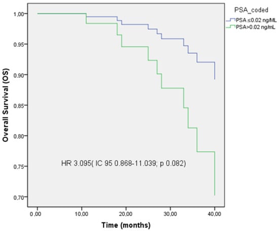 Kaplan–Meier curve of overall survival (OS) stratified by PSA levels ≤ 0.02 ng/mL and >0.02 ng/mL.