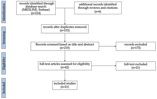 The literature search identified two hundred and fourteen articles. Six additional records meeting the inclusion criteria were identified through reviews and citations. After removing duplicates (n = 5), two hundred and fifteen articles were screened. One hundred and seventy-three articles were excluded based on title and abstract. Forty-two full-text articles were assessed for eligibility and twenty-one articles were excluded based on the inclusion and exclusion criteria. In total, twenty-one studies were included (Figure 1).