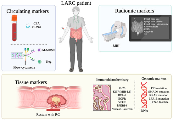Overview of statistically significant biomarkers for tumor response prediction to SCRT, TNT and RT in LARC patients. Created in BioRender. Machado Carvalho, J. (2025) https://www.BioRender.com/seftlv5 (assessed on 18 April 2025).