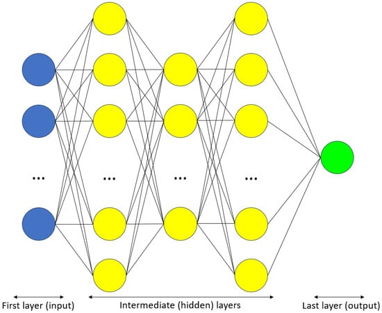Schematic representation of a typical artificial neural network, with multiple hidden layers (i.e., deep learning). Circles represent artificial neurons.