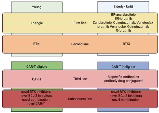 Furthermore, the minimal residual disease (MRD) status after treatment showed in many clinical trials a high prognostic value [,], but the application of MRD in clinical practice is still limited; also, the impact of MRD in the era of new targeted treatments, such as Bruton’s tyrosine kinase inhibitors (BTKis), remains a matter of open debate, particularly because BTKis are administered continuously until disease progression.