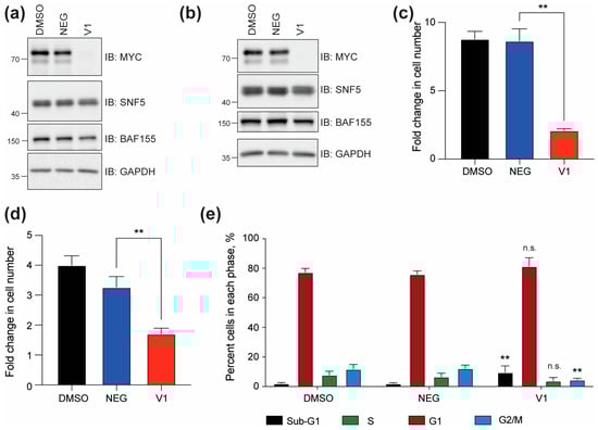 Depletion of MYC in BIN-67 cells. (a) Engineered BIN-67 (clone 1) cells were treated with DMSO, 500 nM dTAGV-1-NEG (NEG), or 500 nM dTAGV-1 (V1) for 24 h to deplete MYC. GAPDH is included as a loading control. SNF5 and BAF155 are SWI/SNF subunits. Uncropped Western blots are included in Figure S1. (b) Engineered BIN-67 (clone 9) cells were treated as in (a) for 24 h to deplete MYC. Similar controls are included. Uncropped Western blots are included in Figure S1. (c) Engineered BIN-67 (clone 1) cells were plated with 500 nM NEG, 500 nM V1, or DMSO and then allowed to grow for five days before recounting. The fold change in cell number was determined using the total cell number obtained on day five as compared to the day of plating. (The error bars are the standard error of the mean, unpaired student’s t-test ** p= 0.0019, n = 3 biological replicates). (d) The engineered BIN-67 (clone 9) cells were plated as in (c), and the fold change was calculated and graphed. (The error bars are the standard error of the mean, unpaired student t-test ** p = 0.0089, n = 4 biological replicates). (e) The engineered BIN-67 (clone 1) cells were plated with 500 nM NEG, 500 nM V1, or DMSO. After five days, a cell cycle analysis was performed, and the data were quantified for each phase, as shown. (The error bars are the standard error of the mean, one-way ANOVA analysis Sub-G1 ** p = 0.0030, G2/M ** p = 0.0018, n.s. = not significant, n = 4 biological replicates).
