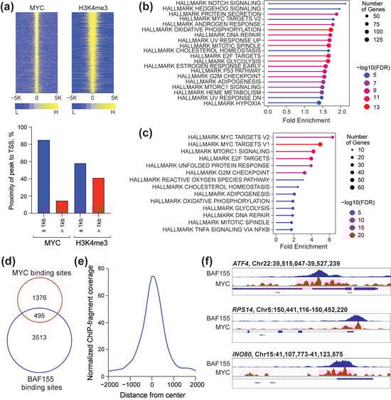 Characterization of MYC chromatin occupancy in BIN-67 cells. (a) Top: Heatmap of normalized MYC and H3K4me3 peak intensity, as determined by CUT&RUN. Signal for each protein within 5 kb from center of peaks is shown in yellow. Bottom: Identified peaks were annotated to their nearest gene, and proximity of peaks to the TSS is shown. (b) Peaks with H3K4me3 signal within 1 kb of a TSS were annotated to their nearest gene and analyzed for enrichment among Hallmark.MSigDB gene sets using ShinyGO 0.82 [36]. (c) Peaks with MYC signal within 1 kb of a TSS were annotated to their nearest gene and analyzed for enrichment among Hallmark.MSigDB gene sets using ShinyGO 0.82. (d) Venn diagram showing the overlap between the number of MYC binding sites detected in this study with those of BAF155 in BIN-67 cells using publicly available sequencing data (GSE117734, [15]). (e) Averaged ChIP-seq fragment coverage for BAF155 at MYC-BAF155 colocalized regions. (f) Binding of MYC and BAF155 at three MYC-BAF155 cobound genes. Image created on Integrative Genomics Viewer [37] using chromatin binding data for both proteins.