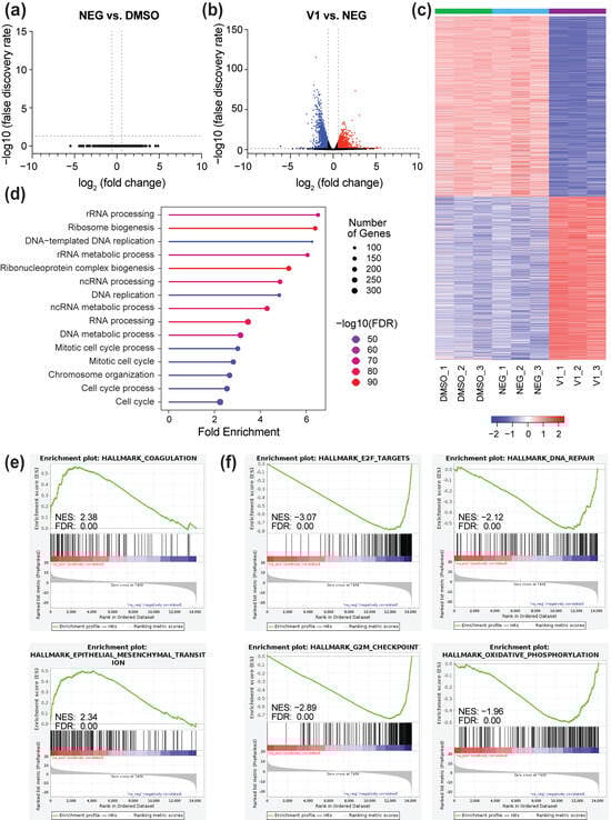Depletion of MYC impacts the expression of diverse sets of genes. (a) The magnitude and significance of gene expression changes resulting from an RNA-seq analysis of engineered BIN-67 cells treated with DMSO or 500 nM dTAGV-1-NEG (NEG) for 24 h. The grey lines denote a false discovery rate (FDR) of 0.05 and a fold change of 1.5. (b) A volcano plot showing the magnitude and significance of gene expression changes from an RNA-seq analysis of engineered BIN-67 cells treated with 500 nM NEG or dTAGV-1 (V1). The blue dots indicate genes that decrease significantly in expression (FDR < 0.05) with a fold change less than −1.5. The red dots indicate genes that increase significantly (FDR < 0.05) in expression and have a fold change that is higher than 1.5. (c) A heatmap depicting z-score-normalized read counts for genes that significantly changed in expression (FDR < 0.05) following treatment with V1. The data for each replicate is included. (d) A gene ontology analysis was performed using genes that decrease in expression following MYC depletion, as determined in the V1 vs. NEG analysis (FDR < 0.05, fold change < −1.5). The analysis was performed using ShinyGO 0.82 [36] and “GO Biological Process”. (e) A gene set enrichment analysis (GSEA) was performed by testing the differentially expressed genes (V1 vs. NEG) against MSigDB hallmark datasets [38,39]. The loss of MYC causes an upregulation of genes related to coagulation and epithelial mesenchymal transition. (f) GSEA was performed as in (e). The loss of MYC downregulates genes related to E2F targets, DNA repair, G2/M checkpoint, and oxidative phosphorylation. The complete GSEA results are in Table S2.