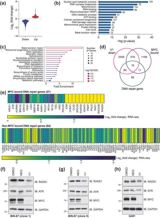 Gene regulation by chromatin-bound MYC. (a) Magnitude of change in expression for genes bound by MYC that go up (red) or down (blue) following depletion of MYC in BIN-67 cells. MYC-bound genes are defined as a gene with an MYC binding site localized within 1 kb of the annotated TSS. (b) Gene ontology analysis of MYC-bound genes that decrease in expression following the depletion of MYC using DAVID Bioinformatics [41,42]. The number next to each bar signifies the number of genes in that category. (c) A KEGG pathway analysis was performed on MYC-bound genes that decrease in expression following MYC depletion. An analysis was performed using ShinyGO 0.82 [36] and the “KEGG pathway database” [40]. (d) A Venn diagram comparing the number of significantly downregulated genes in the V1 vs. NEG RNA-seq analysis with genes annotated to MYC binding sites and a curated list of DNA repair genes from [43]. The Venn diagram was generated using https://molbiotools.com/listcompare.php(Accessed on 3 March 2025). (e) Top: heatmap showing the magnitude of gene expression changes for the 27 MYC-bound DNA repair genes from (d). Genes marked with solid yellow are bound by MYC but have no detectable change in gene expression. Bottom: heatmap showing the magnitude of gene expression changes for the 84 non-MYC-bound DNA repair genes from (d). (f) Western blot showing the levels of MYC, ATR, and RAD51 in BIN-67 (clone 1) cells treated with DMSO, 500 nM NEG, or 500 nM V1 for 24 h. GAPDH serves as a loading control. (g) Western blot as described in (f) for BIN-67 (clone 9) cells treated similarly. (h) Western blot as described in (f) for engineered SNF5-null G401 cells treated similarly. Uncropped Western blots are included in Figure S1.