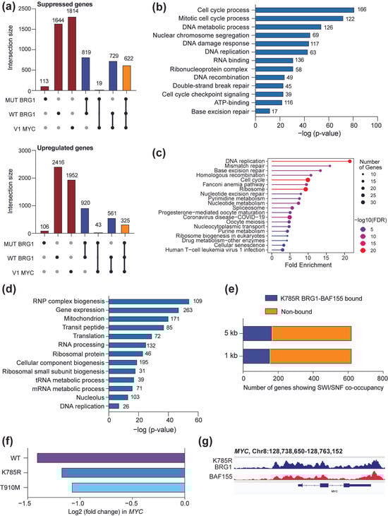Gene regulation by MYC and BRG1. (a) UpSet plot showing the intersection of genes that significantly decrease following the depletion of MYC in BIN-67 cells (V1 MYC) (top) or increase (bottom) with genes that significantly change in the same direction following the reintroduction of wild-type BRG1 (WT BRG1) or ATPase-deficient T910M and K785R BRG1 (MUT BRG1). Gene expression changes following BRG1 reintroduction were reported in [15]. Black dots indicate the gene set(s) included in the intersection analysis and lines indicate the overlap of multiple sets. (b) Gene ontology analysis of the 622 commonly suppressed genes from (a) using DAVID Bioinformatics [41,42]. The number next to each bar signifies the number of genes in that category. (c) A KEGG pathway analysis was performed on the 622 commonly suppressed genes from (a). An analysis was performed using ShinyGO 0.82 and the “KEGG pathway database”. (d) A gene ontology analysis of the 729 genes suppressed by MYC depletion and wild-type BRG1 reintroduction from (a) using DAVID Bioinformatics [41,42]. The number next to each bar signifies the number of genes in that category. (e) Stacked bar graph showing the number of commonly regulated genes from (a) that show chromatin binding of ATPase-deficient BRG1 (K785R) and BAF155 within either 1 kb or 5 kb of a TSS. Chromatin binding data for BAF155 and K785R BRG1 in BIN-67 cells was obtained using publicly available data in GSE117734 [15]. (f) Log2(fold change) in MYC expression as analyzed in [15] when wild-type (WT) or ATPase-deficient T910M BRG1 and K785R BRG1 are reintroduced in BIN-67 cells. (g) K785R BRG1 and BAF155 ChIP-seq peaks at the MYC gene in BIN-67 cells following the reintroduction of K785R BRG1. Image created on Integrative Genomics Viewer [37] using chromatin binding data for both proteins.