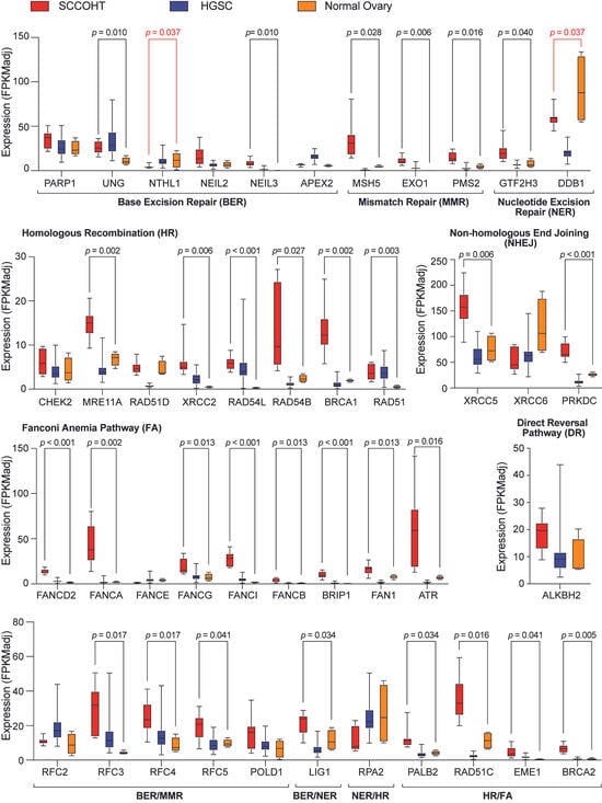 Expression of DNA repair genes is increased in SCCOHT tumors. RNA expression values in 4 normal ovary tissues, 10 SCCOHT tumors, or 45 age-matched high-grade serous ovarian carcinoma (HGSC) cancers for DNA repair genes regulated by MYC in BIN-67 cells. Genes were categorized based on their direct role within one or more specific repair pathways [43]. Box-and-whisker plots show expression of each gene within the indicated repair pathway(s). Boxes mark the 25th to 75th percentiles, with a middle line indicating the median value and whiskers extending from highest to lowest data points. Student’s unpaired t-test was performed on data from SCCOHT tumors and normal ovary tissue for each gene, and p-values are shown. Black p-values indicate a significant increase in SCCOHT tumors versus normal ovary tissue, and red p-values indicate a significant increase in normal ovary tissue versus SCCOHT tumors. A statistical analysis was also performed on data from SCCOHT tumors versus HGSC cancers, and those p-values are located in Table S3.
