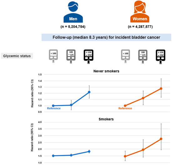 Smoking is a well-established risk factor for bladder cancer in both sexes, contributing to immune suppression and impaired inflammatory regulation [14,15,16]. Likewise, hyperglycemia disrupts immune homeostasis and has been associated with increased bladder cancer risk [17,18,19,20,21]. However, the sex-specific dose–response relationship between glycemic status and bladder cancer risk remains unclear. Previous studies have reported inconsistent findings, with positive associations observed in men [18,19], in women [21,22], or without sex-stratified analyses [20]. These studies have often been limited by small sample sizes, reliance on self-reported diabetes diagnoses, and inadequate adjustment for key confounders, including smoking, obesity, and chronic kidney disease (CKD) [18,19,20,21]. Moreover, the potential interaction between hyperglycemia and smoking in relation to bladder cancer risk by sex has not been thoroughly examined.