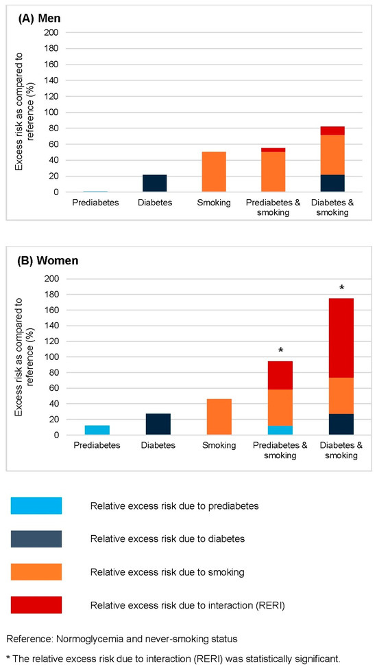 The relative excess risk for bladder cancer conferred by smoking combined with prediabetes and diabetes in men (A) and women (B), based on Model 3. The model was adjusted for age, body mass index, alcohol consumption, physical activity, hypertension, dyslipidemia, urinary tract infection, and chronic kidney disease. The reference group comprised individuals with normoglycemia and no history of smoking, within each sex stratum. Bars represent the relative excess risk from prediabetes, diabetes, smoking, and their interactions. * Significant positive interactions are defined as relative excess risks due to interaction greater than 0 (p < 0.01).