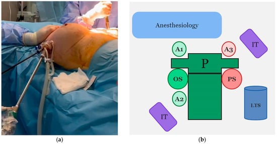 (a) Real-life setting (VAM—right breast, reconstruction—left breast, patient’s head upward): OS’s instrument and A2’s camera entering the single-port piece visible on the right side of the patient, A3 visible on the opposite side; (b) operative theatre setting for bilateral surgery. P: patient, LTS: laparoscopy tower system, OS: oncologic surgeon, PS: plastic surgeon, A1, A2, A3: assistants, IT: instrument table.