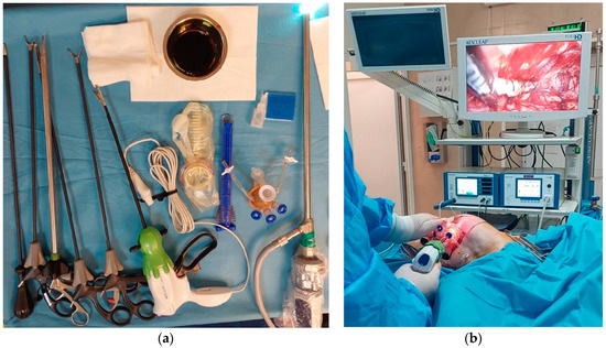 (a) Instruments used in the mastectomy phase (from left to right): laparoscopic atraumatic grasping instruments (×5), Caiman vessel sealer and cutter, wound protector, single-port trocar, laparoscopic camera; (b) intraoperative setting—unilateral surgery (VAM after sentinel lymph node excision).