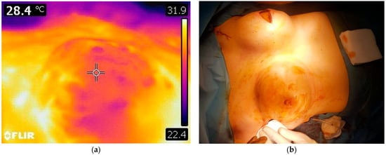 (a) Skin perfusion evaluation using infrared thermography after VAM and implant placement (good perfusion: 27.9 °C on nipple, 28.4 °C surrounding skin flap); (b) symmetry assessment after implant insertion (right breast—VAM and implant reconstruction, left breast—expander replacement with implant).