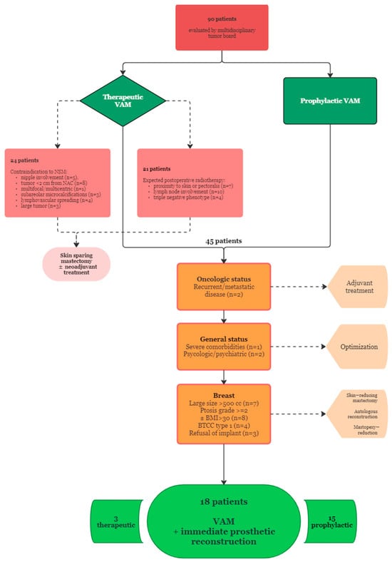 Indications for VAM include risk-reducing (prophylactic) mastectomy (BRCA1/2 mutation, high-risk lesions such as lobular carcinoma in situ, atypical ductal hyperplasia, high-risk patients requesting risk-reducing mastectomy after counseling), early-stage breast cancer (T1 or T2, stage II or below, no evidence of distant metastasis), extensive ductal carcinoma in situ, no evidence of chest wall, pectoralis muscle, skin (ulceration, infiltration) or nipple involvement (hemorrhage, invagination, discharge, Paget’s disease) and tumor location more than 2 cm away from the NAC [8,21,22,23,24,36,37]. Other factors precluding the application of minimally invasive NSM are centrally located tumors, severe lymphovascular invasion and inflammatory breast cancer, as well as obesity, large breast volume/cup > C and severe ptosis, which would require additional mammoplasty for satisfactory cosmetic outcomes [8,21,22,23,24].