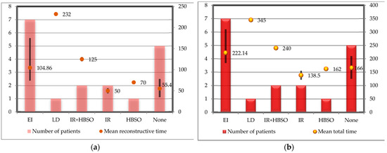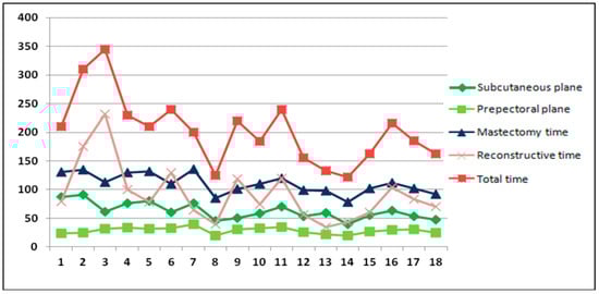 The average mastectomy time was 110.33 min (range: 78–136), the subcutaneous plane dissection lasting longer (62.44 min, range: 40–91) compared to the prepectoral plane dissection (28.89 min, range: 20–40). The mean reconstructive time was 92.38 min, including the procedures performed simultaneously on the patients, most of which were expander replacements with permanent breast implants (7 out of 18 patients) having an average duration of 104.86 min. Only six patients had unilateral breast surgery, with an average reconstructive time of 55.4 min. The reconstructive phase of the procedure lasted from 35 min (unilateral surgery—patient 13) to 232 min (contralateral latissimus dorsi flap and implant reconstruction—patient 4). The addition of prophylactic hysterectomy and bilateral salpingo-oophorectomy resulted in a 75-minute increase of the duration of the second phase of the surgery for bilateral breast reconstruction (two cases) and was limited to a 20-minute increment for unilateral surgery (one case). Summing up, the total duration of the procedure reached an average of 202.72 min (range: 122–345) but only 166 min for unilateral VAM procedures with immediate implant-based reconstruction. The number of patients and mean operative time corresponding to each variation of the procedure are represented in Figure 6.