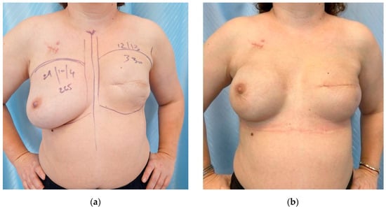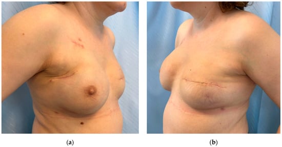 (a) VAM with primary implant reconstruction of the left breast and secondary reconstruction of the right breast using latissimus dorsi flap and implant—front view; (b) right oblique view. Microtextured implants were used—400 mL for the right breast and 450 mL for the left breast.
