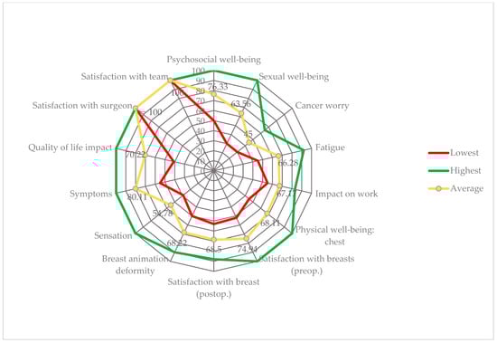 The BREAST-Q questionnaire was distributed to all patients at 12 months postoperatively. The results of the survey are illustrated in Figure 10.