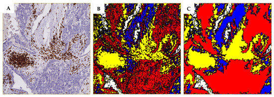 Using an application (APP) module of the VisioPharm software, a smart learning algorithm was developed for digital image analysis. Due to the large image sizes and time-consuming process, a whole region of the tissue section visible on the screen at 5× magnification was randomly selected for further analysis. Regions of interest were defined within the APP, including tumor, stroma, DAB-positive cells, and background. The APP was then trained to accurately recognize and distinguish different cells in each of these regions. If there were any discrepancies between the regions in the samples, the APP was retrained. A preview tool was used to confirm the reliability of the APP training (Figure 1A). A Decision Forest method was used for the classification. Additional post-processing steps were added to the APP as follows: Filling the holes—the area of DAB-positive cells, the area of tumor cells, and the area of the background was filled with itself (Figure 1B,C).