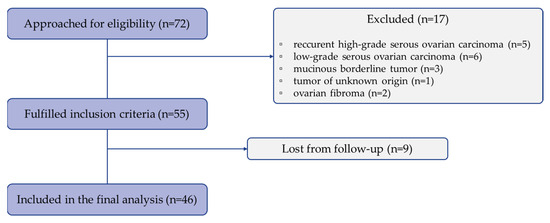 Of a total of 72 patients initially considered eligible for inclusion in the study, after histological confirmation of the diagnosis, 5 patients were diagnosed with recurrent HGSC, 6 with low-grade serous ovarian carcinoma, 3 patients had mucinous borderline tumors, 1 patient had a tumor of unknown origin, and 2 patients had fibromas. As a result, 55 patients met the inclusion criteria. However, due to loss of follow-up data for 9 patients who continued treatment outside the OIL and UMCL, only 46 patients with histologically confirmed primary HGSC were included in the study and considered for further analysis (Figure 2).