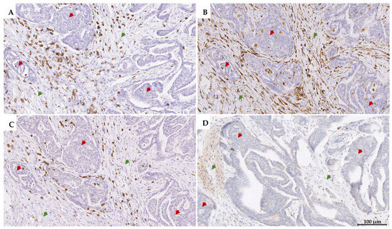 Representative images of (A) CD3+, (B) CD4+, (C) CD8+, and (D) PD-1+ iTILs (brown-stained cells) within the tumor epithelium (red arrows) and sTILs in the tumor stroma (green arrows). For CD4+, most positive cells are macrophages rather than lymphocytes, as evident from their morphology. Images are taken at 100× magnification.