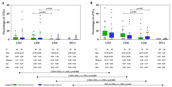 Box plots illustrating the median, minimum, maximum, and interquartile range (Q1–Q3) for CD3+, CD8+, CD4+, and PD-1+ (A) intratumoral tumor-infiltrating lymphocytes (iTILs) and (B) stromal tumor-infiltrating lymphocytes (sTILs), assessed manually (green) and by digital image analysis (blue). Note: the lines under the graphs show the correlation of the total count of CD3, CD8, CD4, and PD-1-iTILs (left graph) vs. their corresponding sTILs (right graph). Abbreviations: Min, minimum; Max, maximum; N, number of patients; Q1, first quartile; Q3, third quartile.