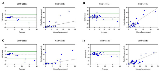 The association and correlation between manual and digital image analysis assessed by Bland–Altman dot plot (left) and Spearman ‘s rank dot plot (right) for (A) CD3+ iTILs, (B) CD3+ sTILs, (C) CD8+ iTILs, and (D) CD8 sTILs.