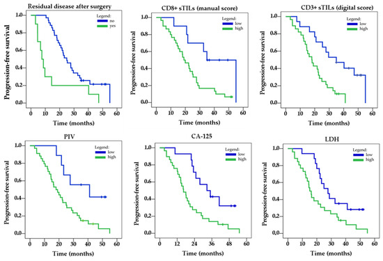 In the multivariate model containing manually assessed sTILs, low PIV (HR = 0.32, 95% CI: 0.11–0.91, p = 0.032) and low CD8+ sTILs (HR = 0.30, 95% CI: 0.11–0.84, p = 0.021) were independent favorable prognostic factors for PFS. However, in the multivariate model with digitally assessed sTILs, all three parameters were independent favorable prognostic factors: low PIV (HR = 0.35, 95% CI: 0.13–0.96, p = 0.040), no residual disease after surgery (HR = 0.21, 95% CI: 0.08–0.53, p = 0.001), and low CD3+ sTILs (HR = 0.16, 95% CI: 0.06–0.42, p < 0.001). The results of the multivariate analysis are shown in Table 4.
