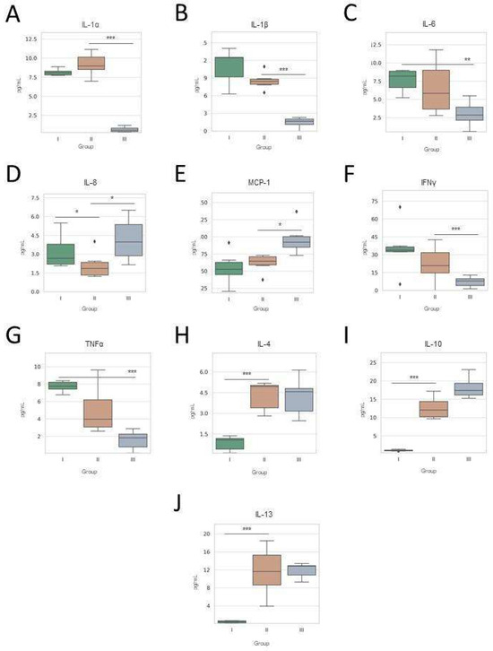 Plasma cytokine dynamics stratified by IFNα exposure group. Boxplots show plasma levels (pg/mL) of 10 cytokines measured in patients categorized by IFNα treatment duration: Group I (early exposure), Group II (intermediate), and Group III (prolonged). (A) IL-1α. (B) IL-1β. (C) IL-6. (D) IL-8. (E) MCP-1. (F) IFNγ. (G) TNFα. (H) IL-4. (I) IL-10. (J) IL-13. Asterisks indicate levels of statistical significance (p < 0.05: *, p < 0.01: **, p < 0.001: ***).