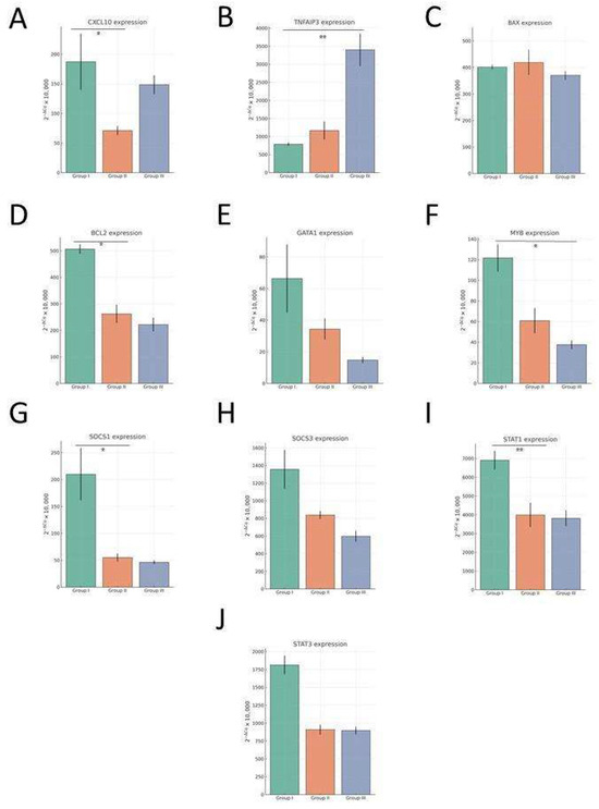 Gene expression dynamics of PBMCs under IFNα exposure in three patient groups. Bars represent mean ± SEM values of gene expression (2−ΔCq × 10,000). Groups correspond to increasing durations of IFNα treatment (Group I: early; Group II: intermediate; Group III: prolonged). (A–J) Expression levels of selected genes, grouped by functional categories: (A,B) Interferon-response and chemokine genes: CXCL10 (A), TNFAIP3 (B); (C,D) Apoptosis regulators: BAX (C), BCL2 (D); (E,F) Hematopoietic transcription factors: GATA1 (E), MYB (F); (G–J) JAK/STAT pathway components: SOCS1 (G), SOCS3 (H), STAT1 (I), STAT3 (J). Asterisks indicate statistical significance between groups (p < 0.05: *, p < 0.01: **).