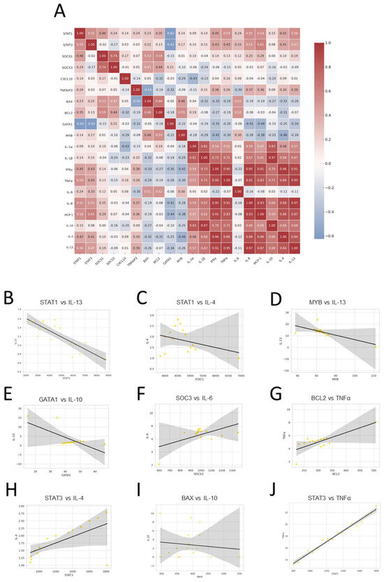 Correlations between gene expression and cytokine concentrations in patients under IFNα treatment. (A) Heatmap showing Spearman correlation coefficients between gene expression levels (2−ΔCq × 10,000) and plasma cytokine concentrations across all patients (n = 18). (B–J) Scatter plots illustrating selected gene–cytokine relationships. (B) STAT1–IL-13. (C) STAT1–IL-4. (D) MYB–IL-13. (E) GATA1–IL-10. (F) SOCS3–IL-6. (G) BCL2–TNFα. (H) STAT3–IL-4. (I) BAX–IL-10. (J) STAT3–TNFα. Each plot displays the fitted regression line and 95% confidence interval. Spearman’s correlation coefficient (ρ) and the associated p-value are indicated in each panel. Asterisks indicate levels of statistical significance. Data reflect a gradual modulation of gene–cytokine networks associated with interferon alpha exposure.