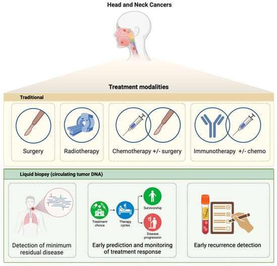 Overview of therapeutic strategies for head and neck cancers. Traditional modalities include surgery, radiotherapy, chemotherapy (with or without surgery or radiotherapy), and immunotherapy (with or without chemotherapy). Emerging liquid-biopsy approaches that analyze circulating tumor DNA (ctDNA) enable detection of minimal residual disease, real-time assessment of treatment response, and early identification of recurrence.