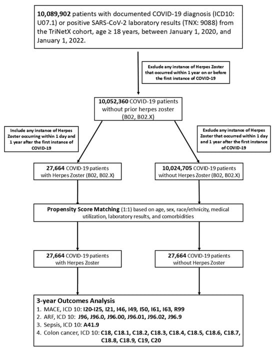 The study evaluated four key outcomes over a 3-year follow-up: major adverse cardiovascular events (MACE; ICD-10: I20–I25, I21, I46, I49, I50, I61, I63, R99), acute respiratory failure (ARF) (ICD-10: J96, J96.0, J96.00, J96.01, J96.02, J96.9), sepsis (ICD-10: A41.9), colorectal cancer (ICD-10: C18, C19, C20). This design enables robust comparisons of long-term risks associated with HZ among COVID-19 survivors, providing clinically meaningful insights for risk stratification, surveillance, and preventive care in vulnerable populations.