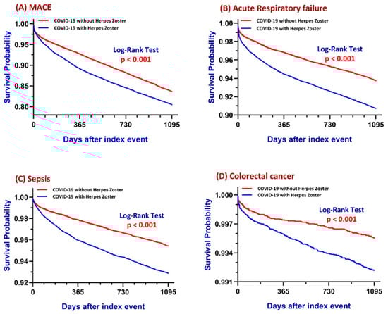 To evaluate the robustness of our findings, we conducted multiple sensitivity analyses. First, we assessed outcome risks using Kaplan–Meier survival analysis before and after propensity score matching (PSM). Across all outcomes—major adverse cardiovascular events (MACE), acute respiratory failure (ARF), sepsis, and colorectal cancer (CRC)—COVID-19 patients who developed herpes zoster (HZ) showed significantly higher risks compared to those without HZ. These associations remained consistent and statistically significant following PSM, indicating that baseline differences were adequately controlled (see Supplementary Table S3).