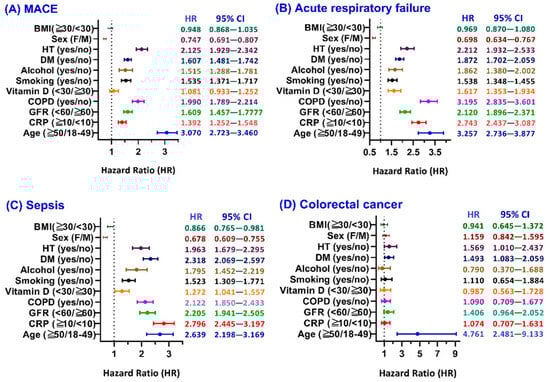 Subgroup analysis of 3-year risk for (A) major adverse cardiovascular events (MACE); (B) acute respiratory failure (ARF); (C) sepsis; and (D) colorectal cancer in COVID-19 patients with or without HZ. The vertical dashed line indicates a hazard ratio of 1.0, representing no difference in risk between groups.