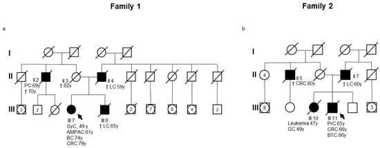 (a,b) Pedigree of the families involved in this study. Squares indicate men and circles indicate women. The arrow indicates the index case. Black-filled symbols denote individuals with cancer, and unfilled symbols indicate unaffected individuals. Slashed symbols denote dead individuals. The following clinical manifestations are noted below each filled symbol: AMPAC = ampullary adenocarcinoma; BC = breast cancer; BTC = biliary tract cancer; CRC = colorectal cancer; GC = gastric cancer; GyC = gynecological cancer; LC = lung cancer; PC = pancreatic cancer; PrC = prostate cancer; age at diagnosis (y = years); age at death (†).